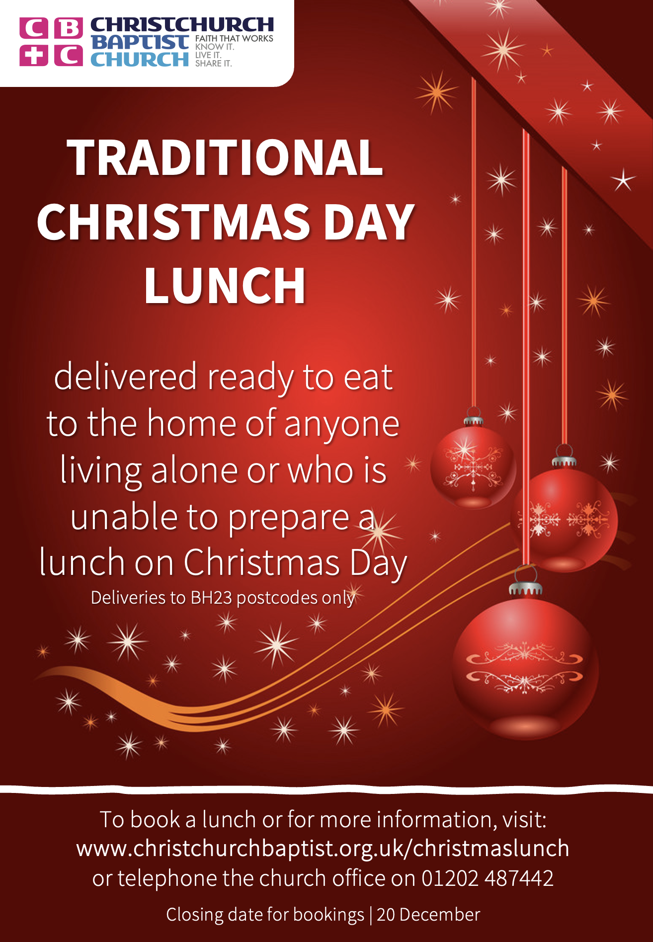 We have now reached full capacity. However, please contact our church office on 01202 487442, and we will be glad to add you to our waiting list and/or explore other ways we may be able to support you. On Christmas Day, we would love to provide a traditional Christmas Day lunch to bless anyone who lives alone (in the BH23) area or who is unable to prepare a lunch. Meals will be delivered to your door, ready to eat. To book a lunch for yourself or someone else, click here or the graphic below. Once you've registered, Debs Marshall will be in contact to make arrangements for the delivery of the meal. |