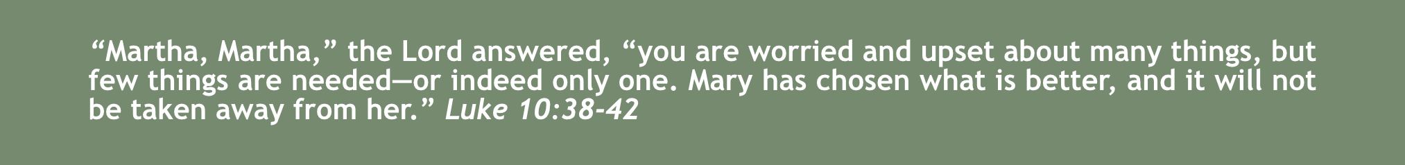 hat a beautiful response from Jesus. I imagine His voice full of love and His eyes with compassion as He repeats her name “Martha, Martha”. Jesus could rebuke her for this disrespectful outburst, but He offers her gentle correction. He speaks truth and light into her troubled heart - she is worried and upset about many things, yet only one thing is needed.