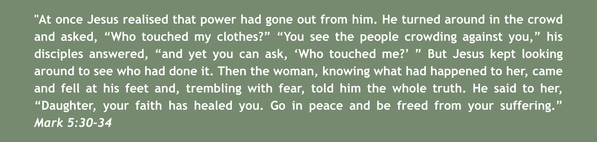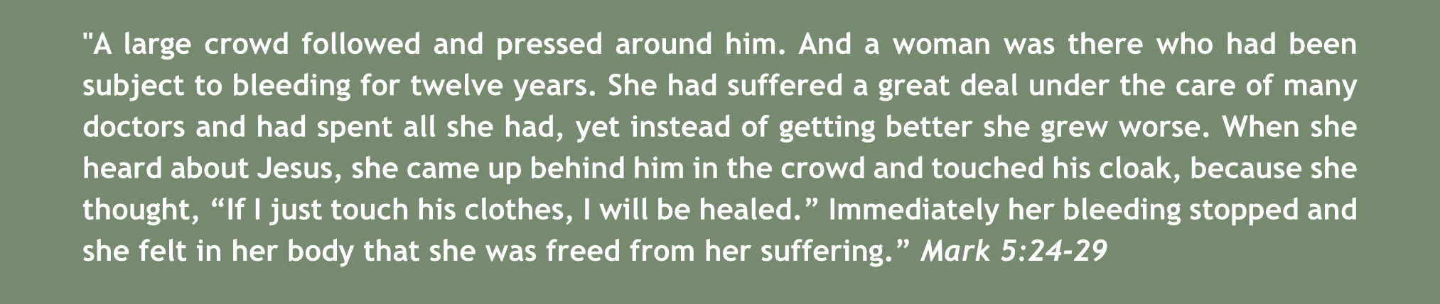 Imagine this woman, bleeding for twelve years. Twelve years. It’s exhausting enough for a female to manage their menstrual cycle for a few days each month, but to bleed for so many years - it’s hard to imagine! The pain, the fatigue, the disgrace - the shame - not to mention the isolation - this woman would likely have been excluded for over a decade.